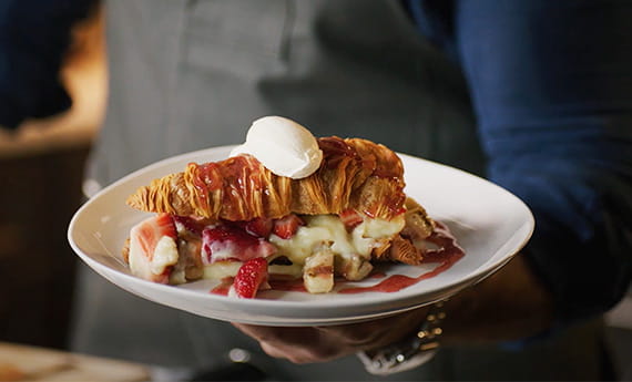 Rejoignez le chef Carmine di Giovanni chez lui pour sa création de la Sfogliatella Napoléon, un dessert d'inspiration française aussi gourmand que raffiné, réalisé en exclusivité avec DXV. Découvrez les techniques professionnelles du chef Carmine et son approche unique pour ce dessert gourmand, composé d'ingrédients clés comme la sfogliatella, les fraises, la crème de banane et la crème fouettée fraîche.